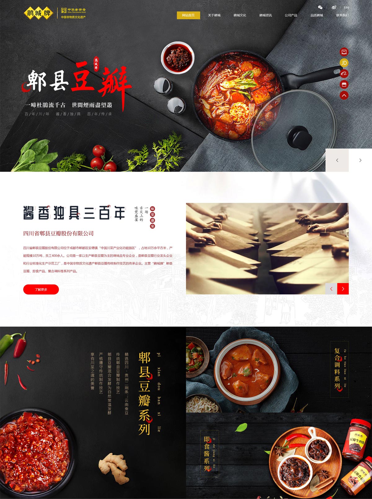 四川省郫縣豆瓣股份有限公司位于成都市郫都區(qū)安德鎮(zhèn)“中國川菜產(chǎn)業(yè)化功能園區(qū)”,占地10萬余平方米,產(chǎn)能規(guī)模10萬噸,員工400余人。公司是一家以生產(chǎn)郫縣豆瓣為主的調(diào)味品專業(yè)企業(yè),是郫縣豆瓣行業(yè)龍頭企業(yè)和行業(yè)標(biāo)準(zhǔn)化生產(chǎn)示范工廠,是中國非物質(zhì)文化遺產(chǎn)郫縣豆瓣傳統(tǒng)制作技藝的傳承企業(yè)。主營“鵑城牌”郫縣豆瓣、即食產(chǎn)品、復(fù)合調(diào)料等系列產(chǎn)品。