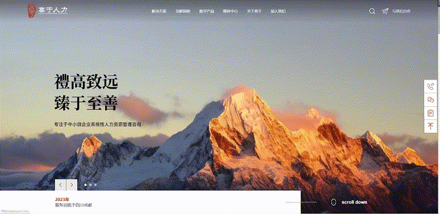高于人力官方網站主頁主色調的設計理念為“數字未來”,頁面多處加入“光束流動”效果,以凸顯高于人力的專業屬性咨詢特色和發展成全國咨詢企業行穩致遠的步伐。