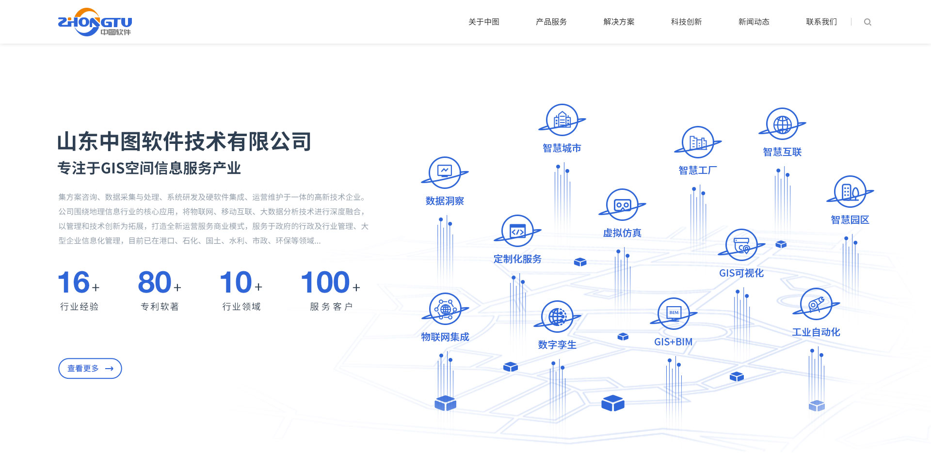 山東中圖軟件技術(shù)有限公司創(chuàng)立于2016年,我們以為客戶創(chuàng)造價(jià)值為己任,以提升客戶極致體驗(yàn)為宗旨,以產(chǎn)品創(chuàng)新為核心,聚焦戰(zhàn)略客戶并提供長(zhǎng)期服務(wù),現(xiàn)已發(fā)展成為技術(shù)實(shí)力突出,服務(wù)智慧園區(qū)、智慧城市、軍工多個(gè)業(yè)務(wù)領(lǐng)域的創(chuàng)新型科技企業(yè)。