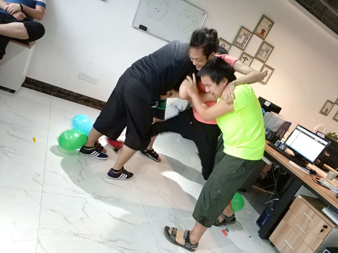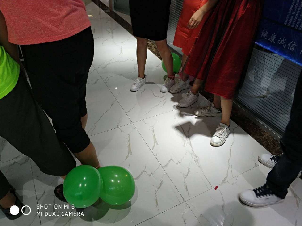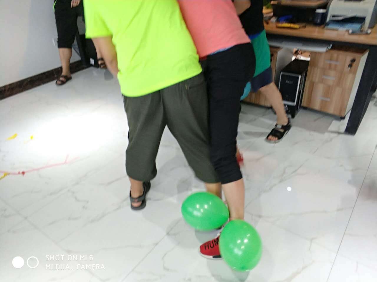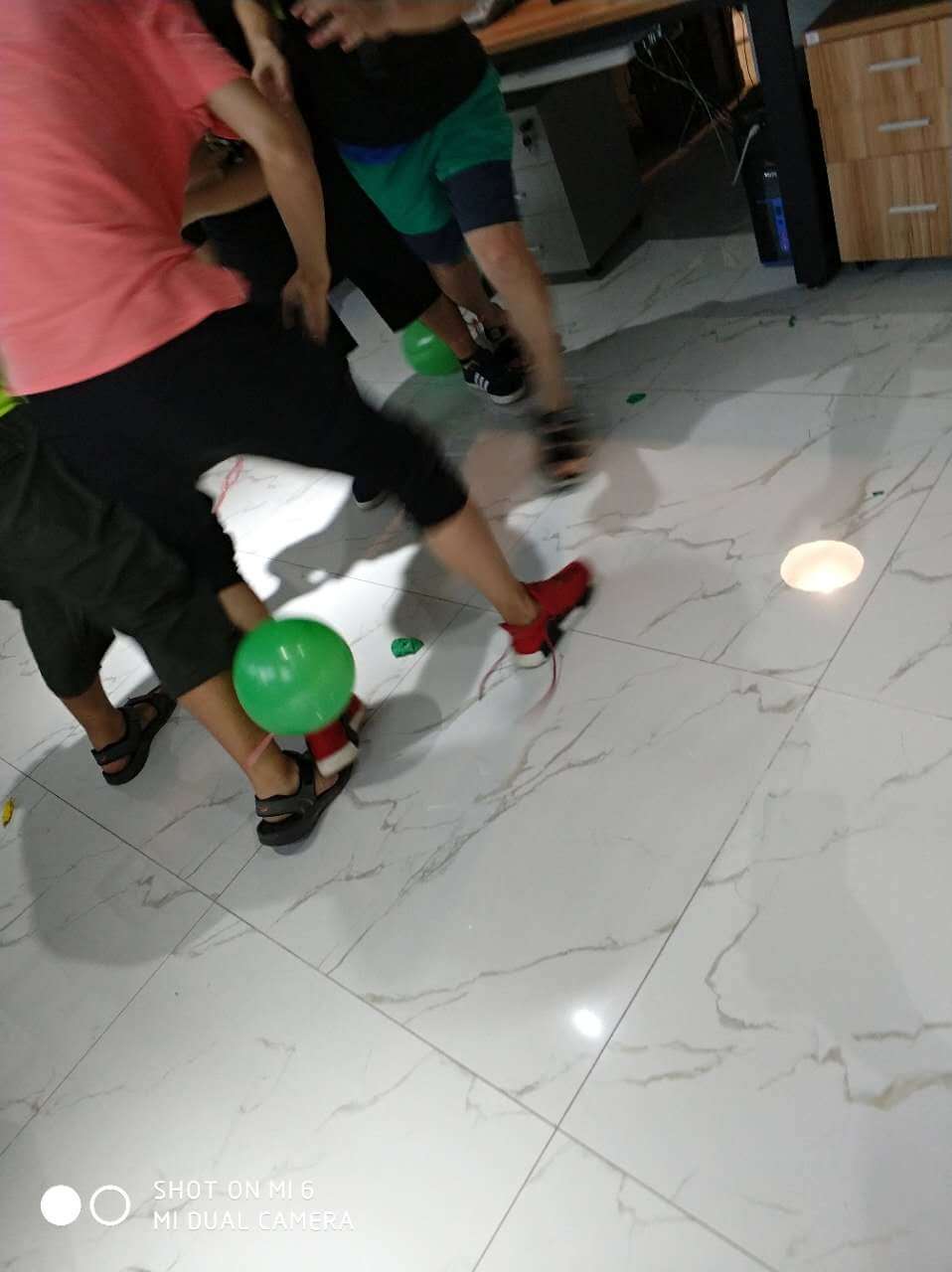 時間過得相當(dāng)?shù)目欤唤?jīng)意就來到了最后一個環(huán)節(jié),踩氣球。兩隊每兩個成員綁上氣球,相互對抗,踩爆他的球~~~噢!!!小編似乎看到了一場血雨腥風(fēng)。